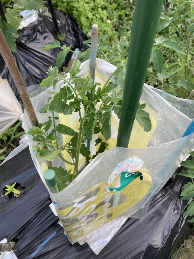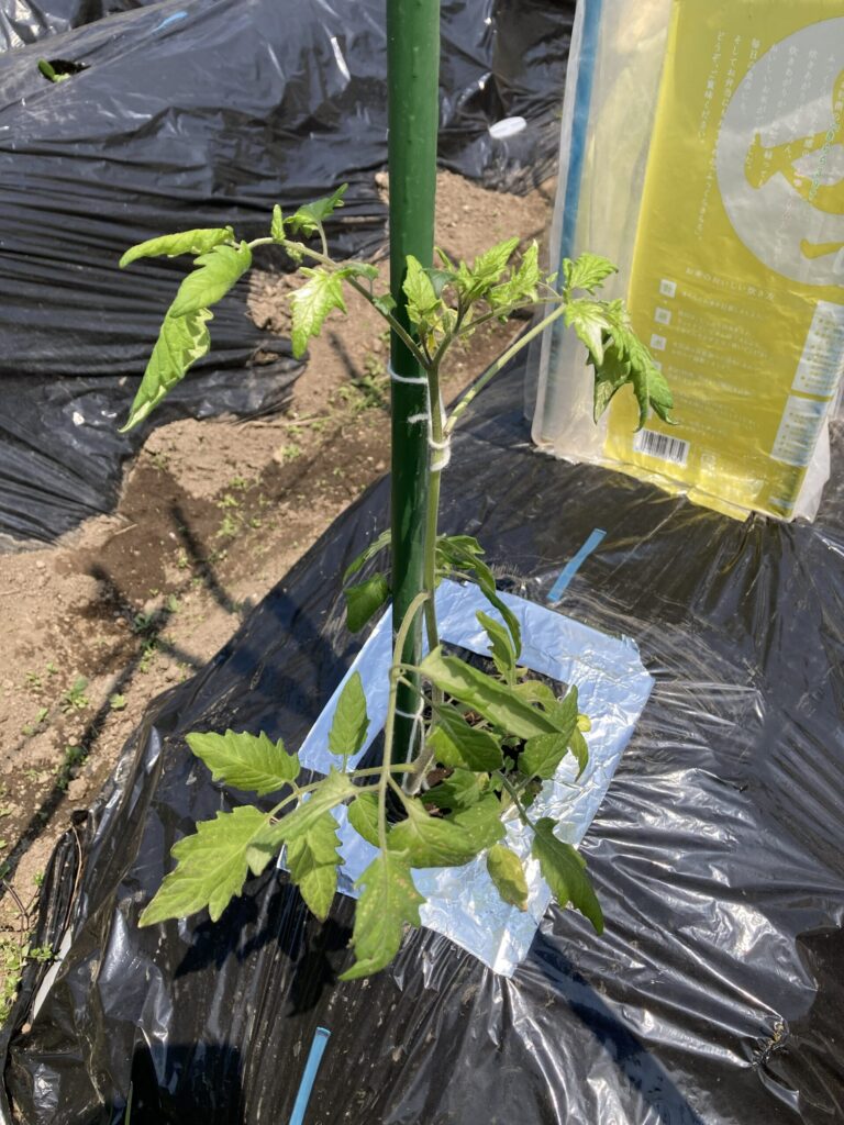 前年の経験から寒さには弱いので、植え付けは気温が10℃を下回らなくなる時期を選定。寒冷地である北海道では結局、5月下旬の作業になります。もちろん、初期の苗がこごえないように、風対策もしっかり行います。例年、支柱は株一つに対して一本のみとしていたが、畝にある株同士の支柱を連結して安定感を上げました。おかげで、ミニトマト栽培している感がUP。(←これかなり大きい!)