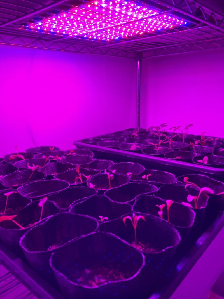 種から芽が出たら、培養土を入れた育苗ポットに移し、ヒーターマットを敷いた育苗箱で育てる。育苗箱使用はカビ防止のため苗高4~5センチまで。日中はLEDライトを使用。できる範囲で窓際で日光も浴びさせた。